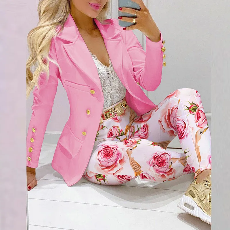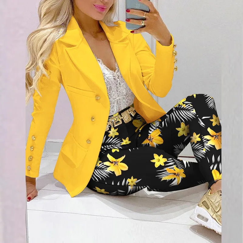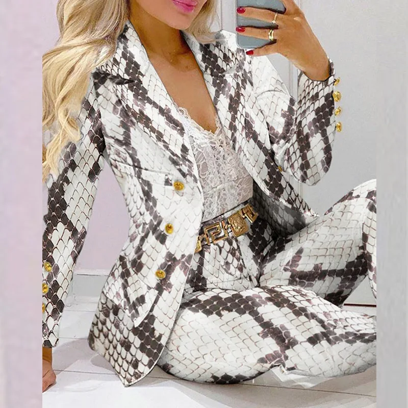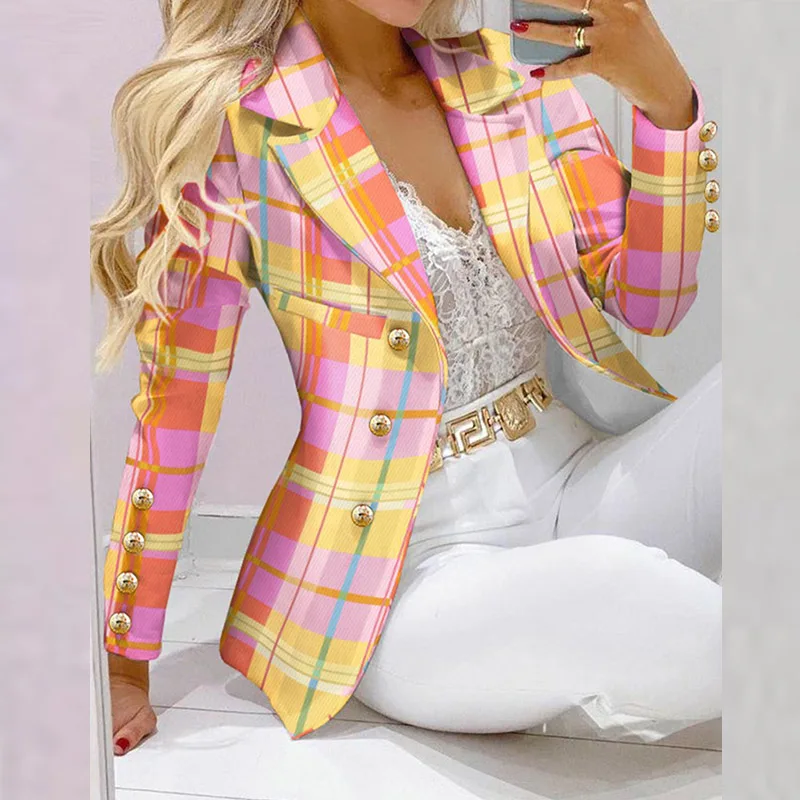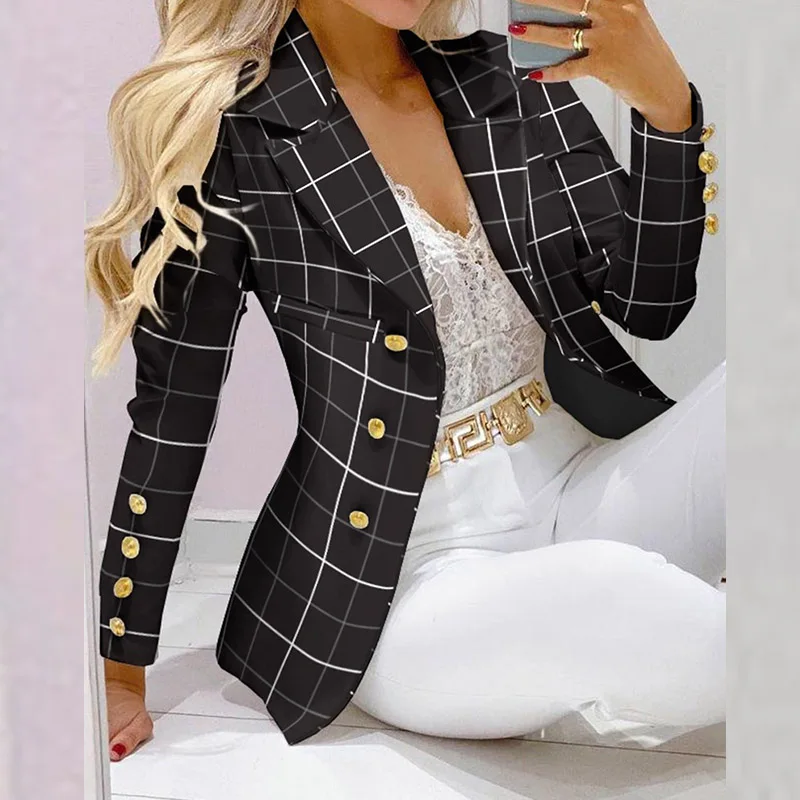 Boss Lady Plaid Printed Blazer Long Pants Suits, Women's Casual Long Sleeve Two Piece Sets, Fashionable Business Attire Elegant