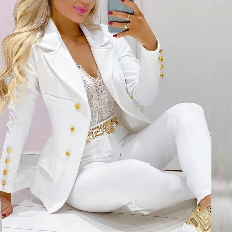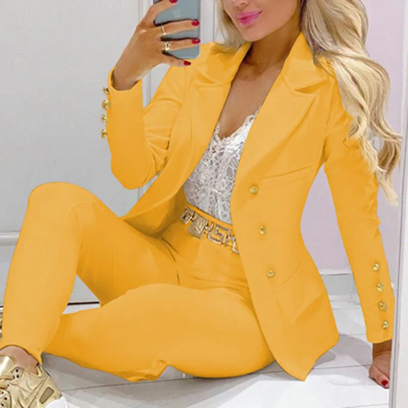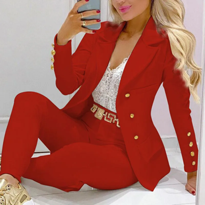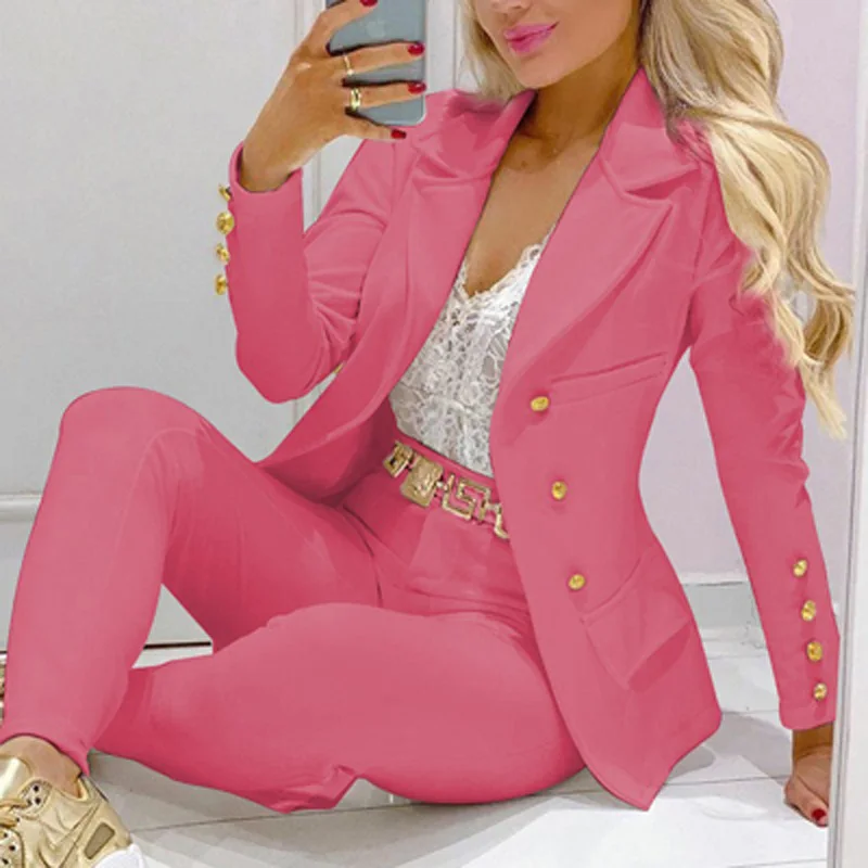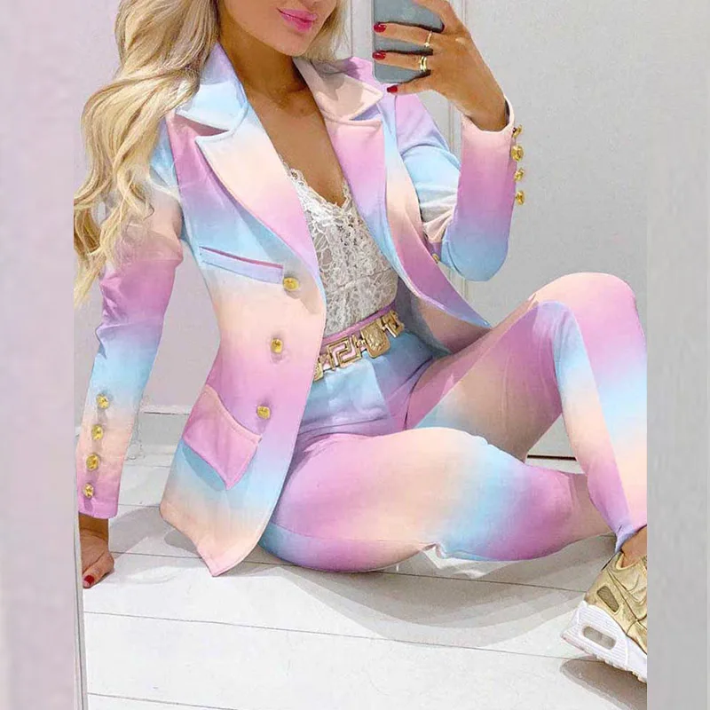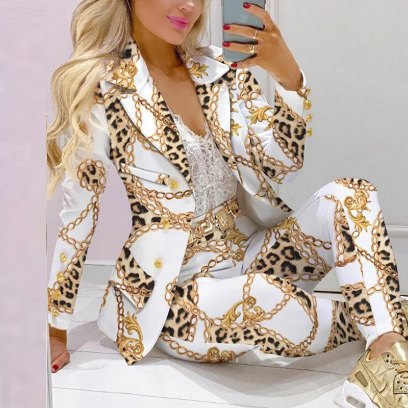 Boss Lady Plaid Printed Blazer Long Pants Suits, Women's Casual Long Sleeve Two Piece Sets, Fashionable Business Attire Elegant