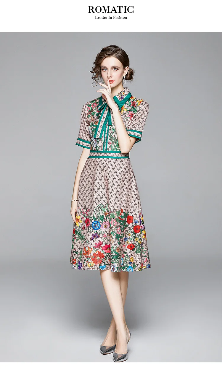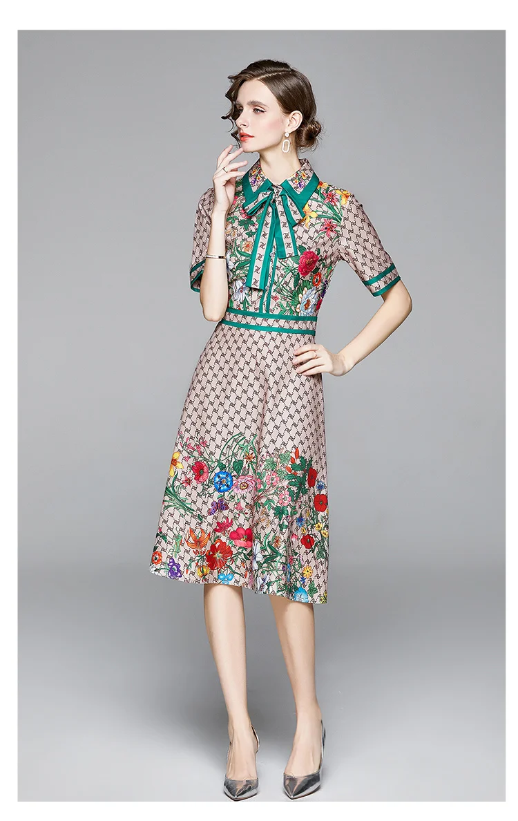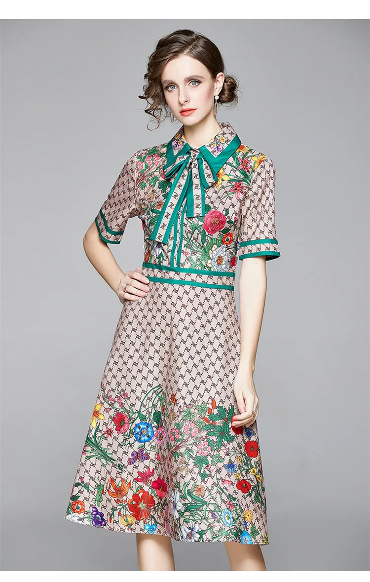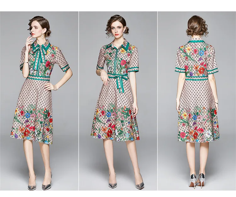 Runway Ready! Bowknot Dress Women's Short Sleeve Shirt Collar Floral Letter Printed Khaki Midi Dresses