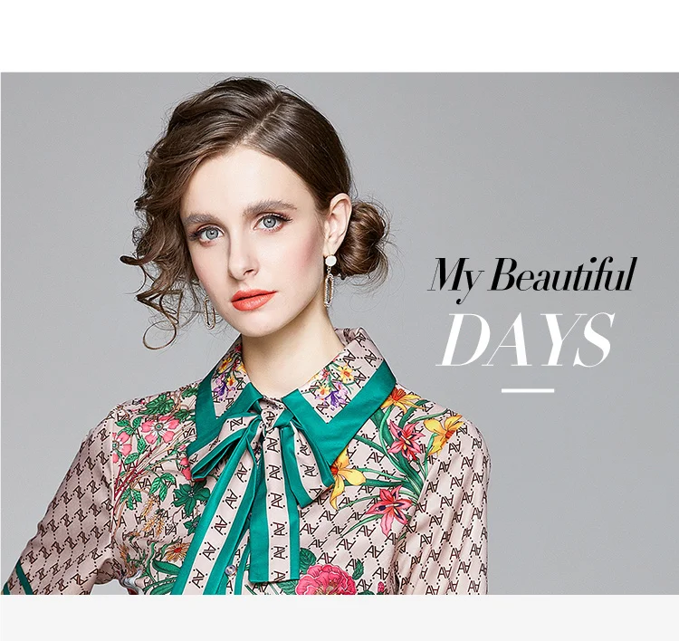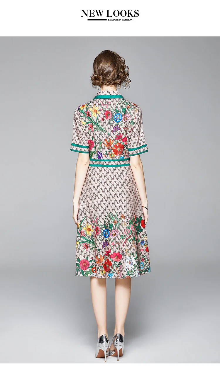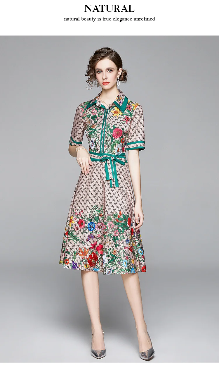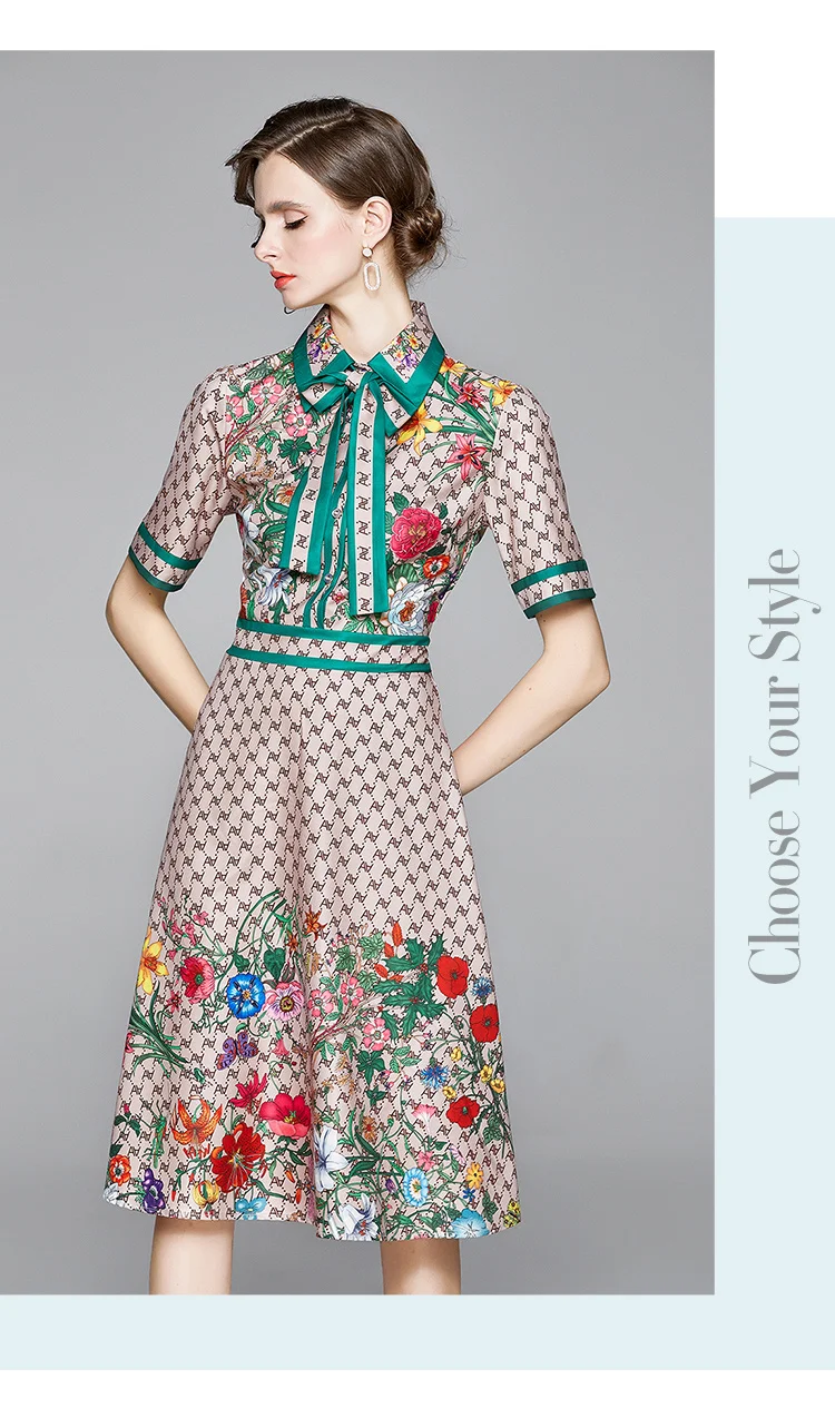 Runway Ready! Bowknot Dress Women's Short Sleeve Shirt Collar Floral Letter Printed Khaki Midi Dresses
